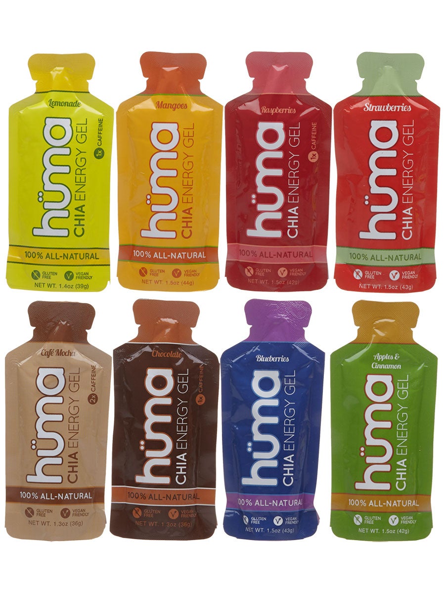 Huma Chia Energy Gel, Variety Pack, 12 Gels (1 each of 8 flavors, plus Running Gels Huma Using fruit puree as an ingredient offers a more pleasant experience than the typical syrupy mixture. It provides 100 calories and 21 g of carbohydrates. Running Gels Huma.