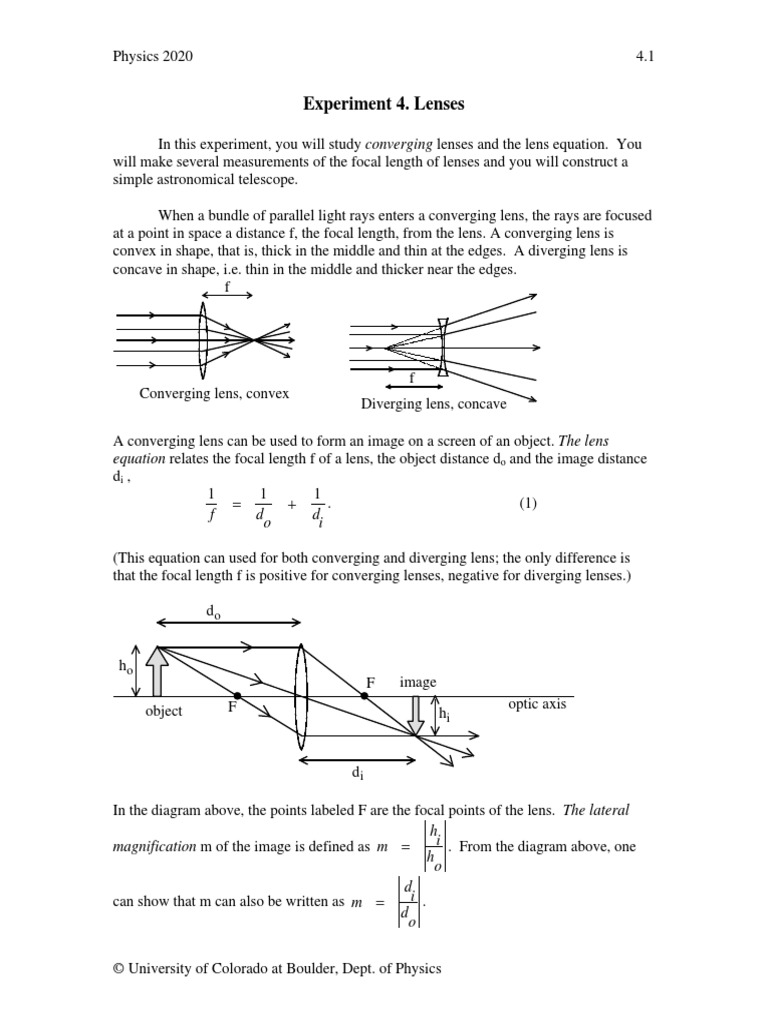 Experiment 4. Lenses Equation Relates The Focal Length F of A Lens